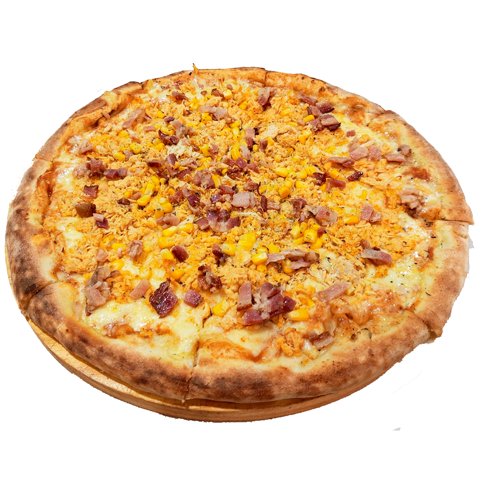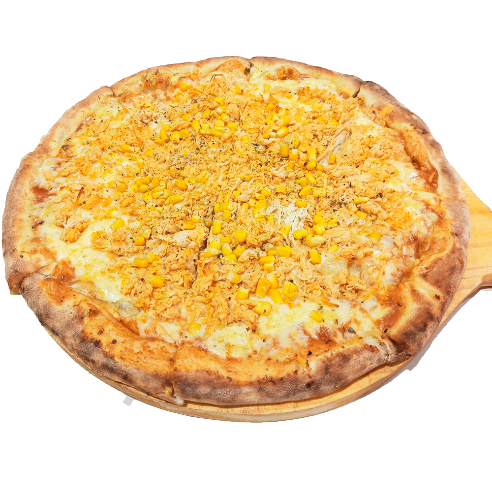 Molho caseiro, mussarela, frango desfiado, milho, catupiry, tomate e orégano