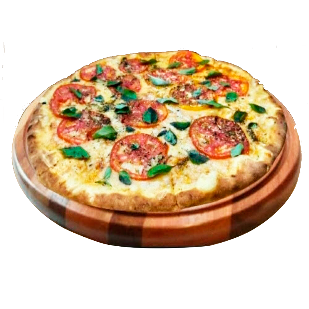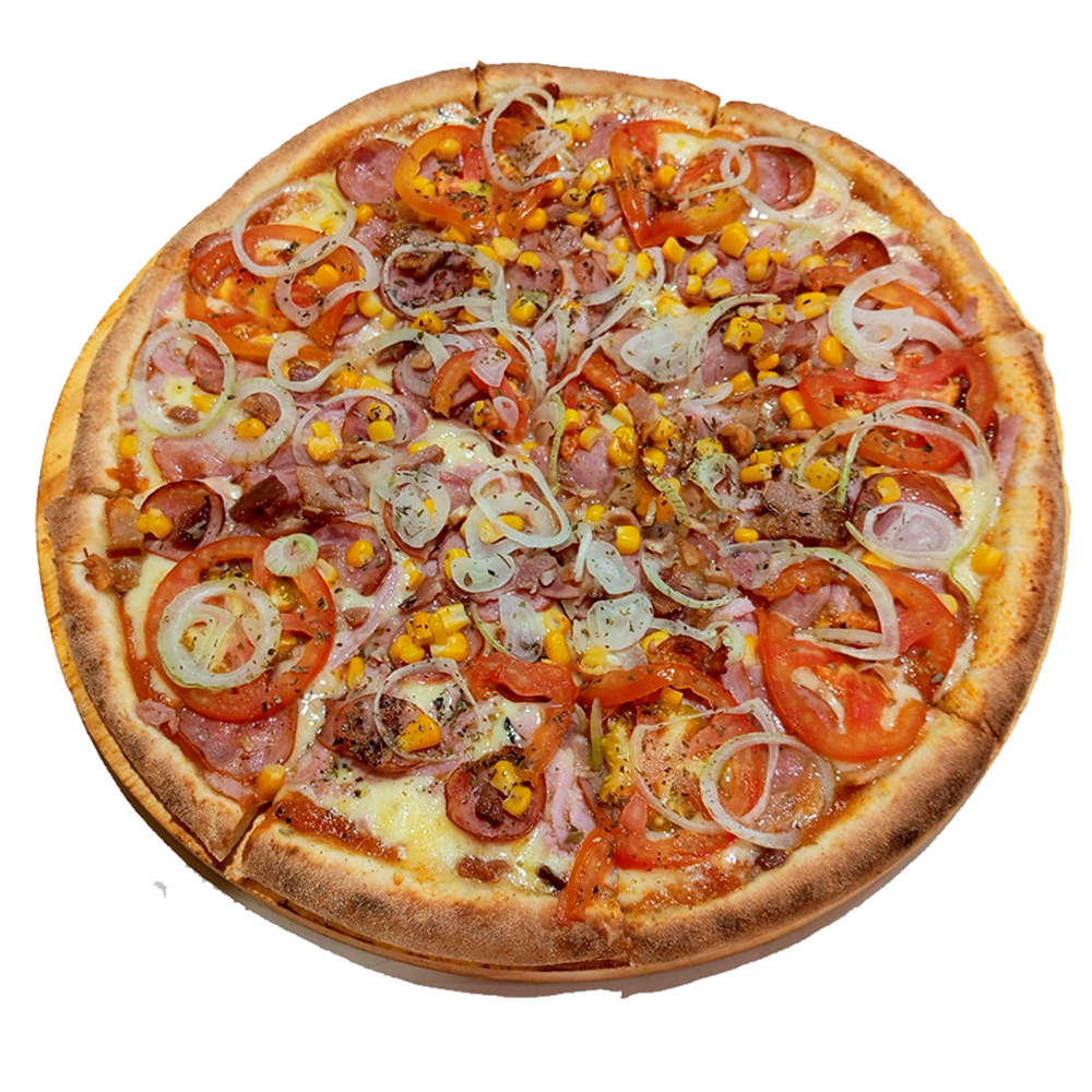 Molho caseiro, tomate, presunto, mussarela, rodelas de tomate, cebola e orégano