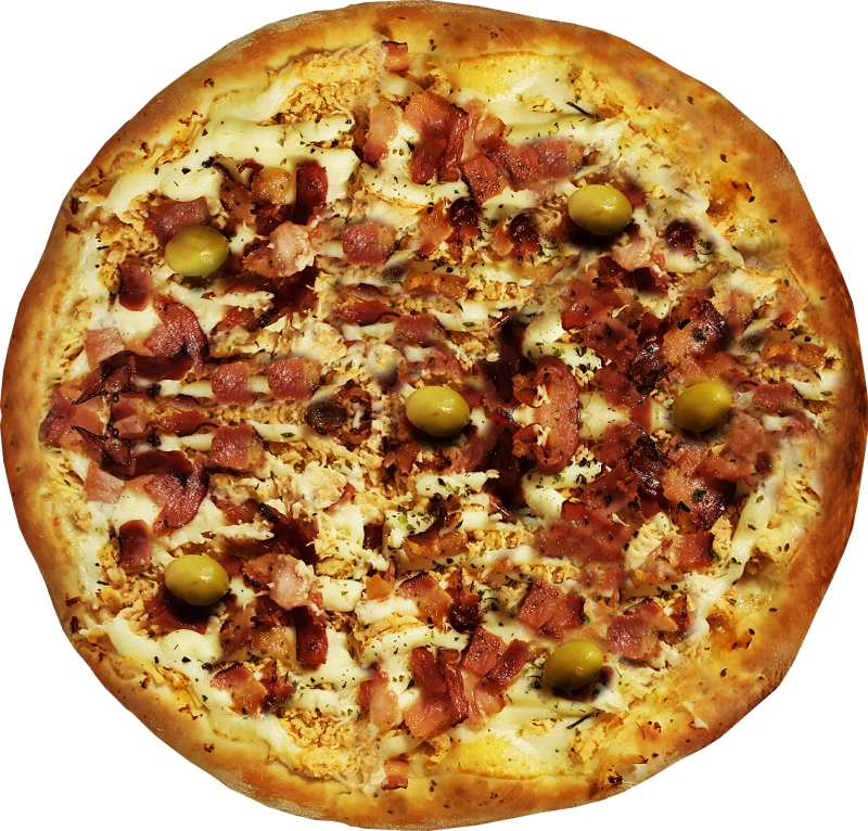 Molho caseiro, mussarela, bacon, catupiry caseiro e orégano