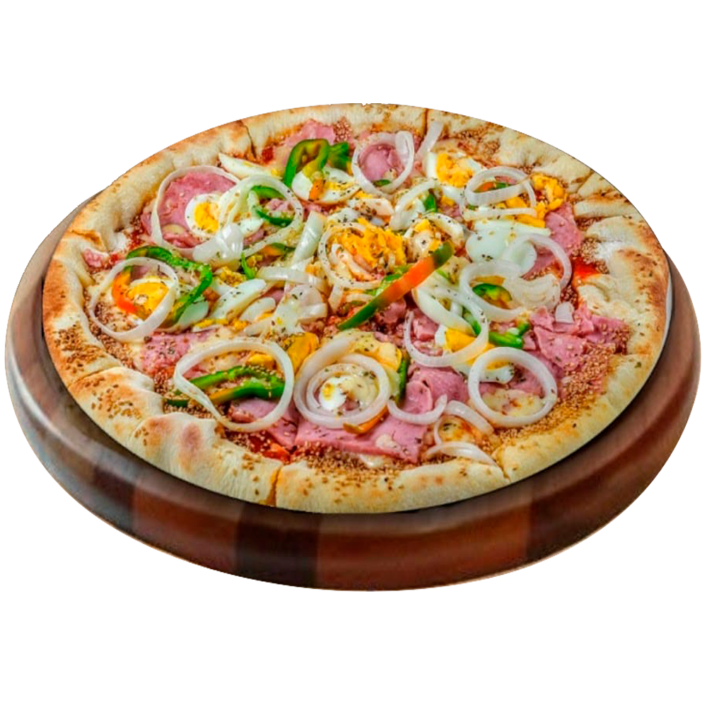 Molho caseiro, mussarela, presunto, ovos, cebola, catupiry caseiro e orégano
