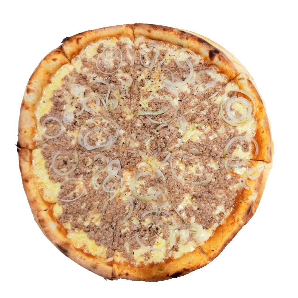 Molho caseiro, atum, mussarela, rodelas de tomate, cebola e orégano