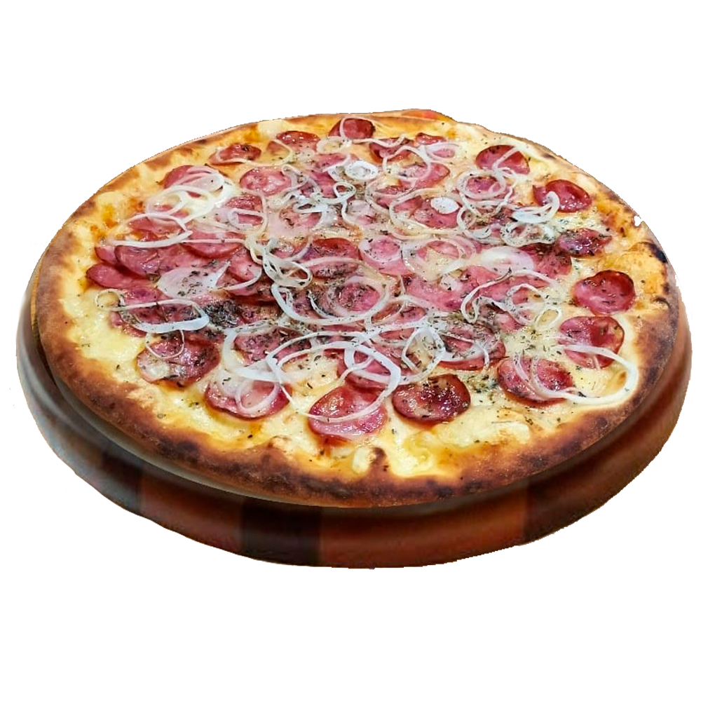 Molho caseiro, mussarela, calabresa, cebola e orégano