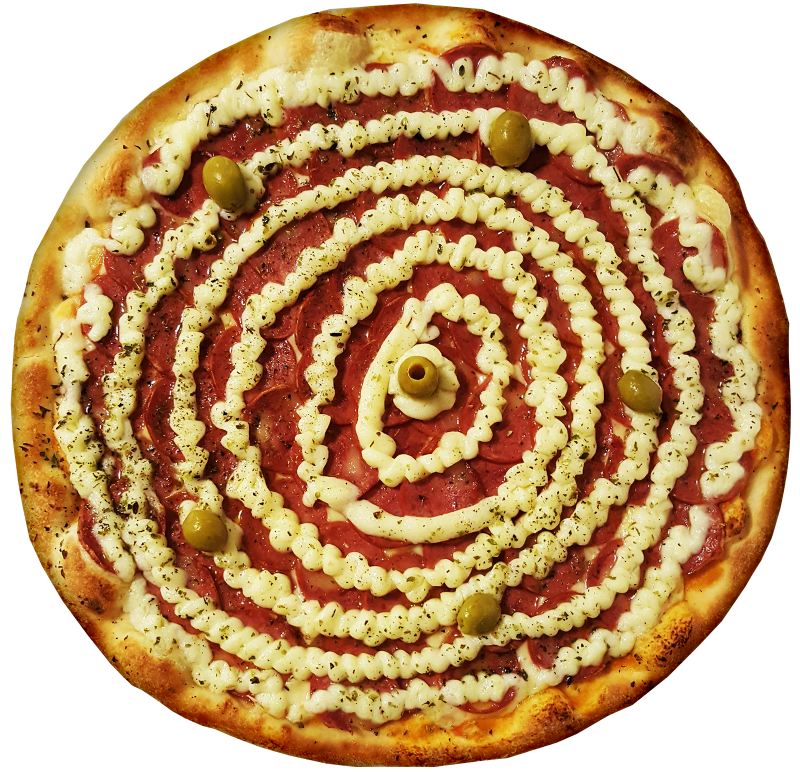 Molho caseiro, mussarela, calabresa, catupiry caseiro e orégano