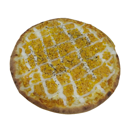 Molho caseiro, milho, mussarela, rodelas de tomate e orégano